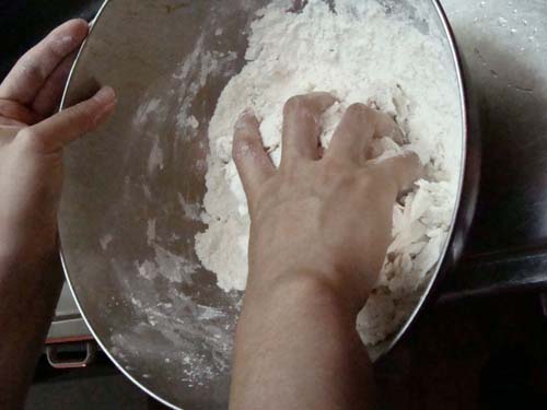 ある程度まとまったところで、手でこね始めます。