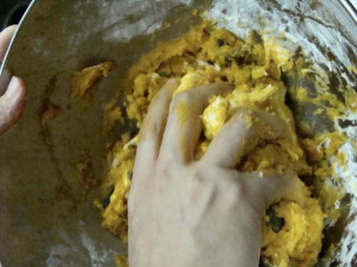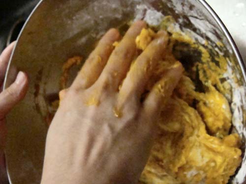 なんとか混ぜて……(握るようにこねます)