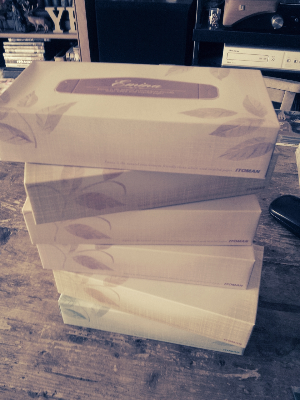 近所のディスカウントストアがリサイクルマシーンを導入し、その初回キャンペーンで先着の人には箱ティッシュをくれるというので、喜び勇んで行ってきました。三日間通い、ちょうど溜まっていたダンボール・ペットボトル・古紙で計6箱ゲット。