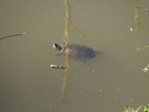 頬に赤い線が見えるので、ミドリガメかなあ。