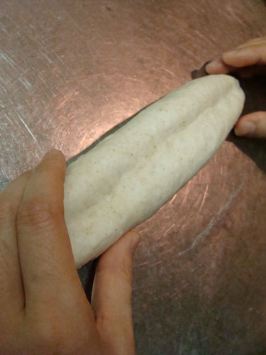 ちょっとだけ綴じ目を押さえて、溝を作ります。